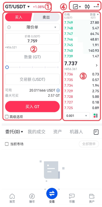 ①选择对应的交易对进行交易 ②在“买入”/“卖出”页面,选择委托条件,可设置“委托价格”、“委托数量” ③可以从右侧盘口处选择以对应价格进行“买入”/“卖出”操作 ④从左到右分别为所选交易对K线图展开;所选交易对行情数据分析等详情界面;交易功能设置