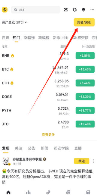 登录币安App,点击【充值/买币】 - 【快捷区】右上角三个点。