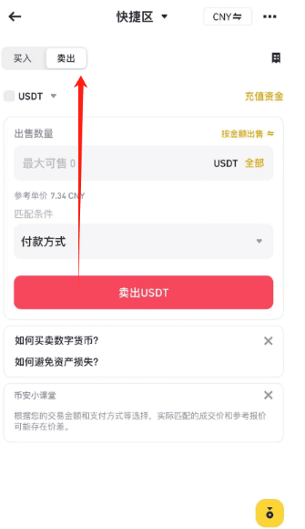 以USDT为例:打开币安APP首页,点击【快捷买币】―【去卖币】―输入【卖出数量】或【金额】―【出售USDT】―【确定】―选择收款方式,【确认出售】