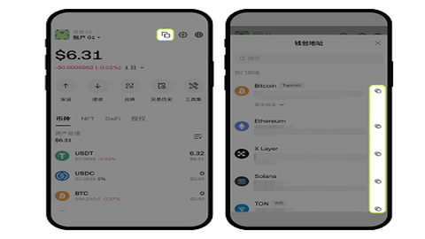 点击【复制地址】图标,选择您想交易的网络所对应的钱包地址,转账给该地址即可充币。