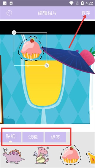 3、在【编辑相片】页面,借助【贴纸】【滤镜】【标签】装饰图片,编辑完毕点击右上角【保存】。