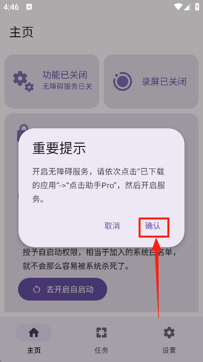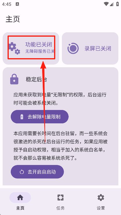 1、打开软件后,首先进入主界面,找到并开启无障碍服务权限。