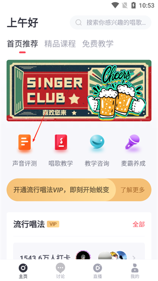 1、打开歌者盟App,进入界面后先进行声音测试,了解自身嗓音状况。