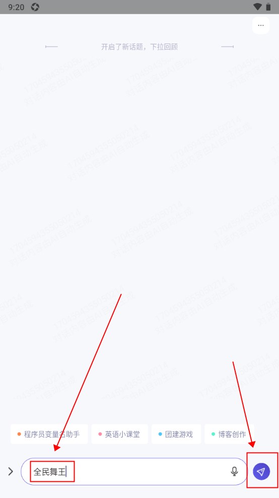 进入app后点击下方输入栏,输入“全民舞王”字样,点击发送。
