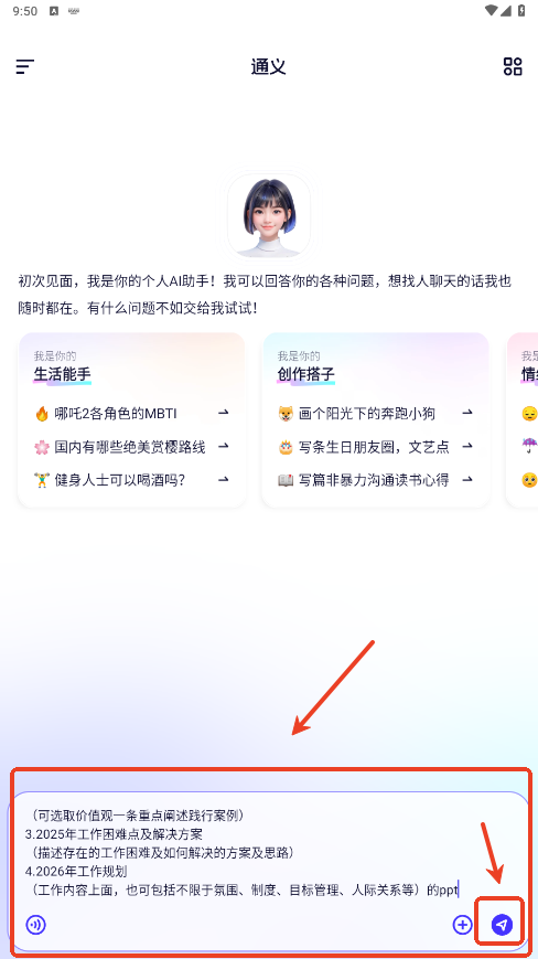 1.进入软件在下列对话框中输入你ppt框架,点击发送。