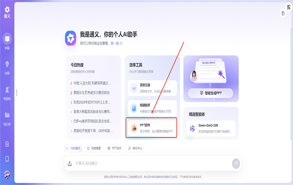 3.你也可以登录千问官方网址。https://tongyi.aliyun.com/qianwen/点击效率工具中的ppt创作。