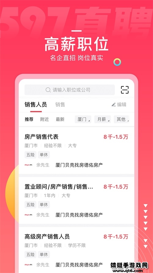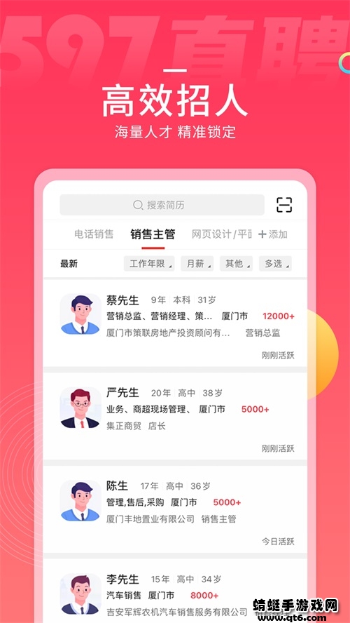 597直聘app是一款专业的在线 求职招聘找工作软件,精准匹配招聘者和求职者,快速查看。海量的招聘用户每天都会在这里发布招聘信息,求职者可以根据自己的意愿选择,当然同时也许多有优秀的求职人才简历提供给招聘者刷选,在这里双方可以互相选择。