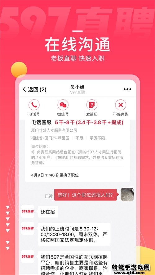 4.通过597直聘app直接与老板进行沟通,微聊或及时的电话联系。