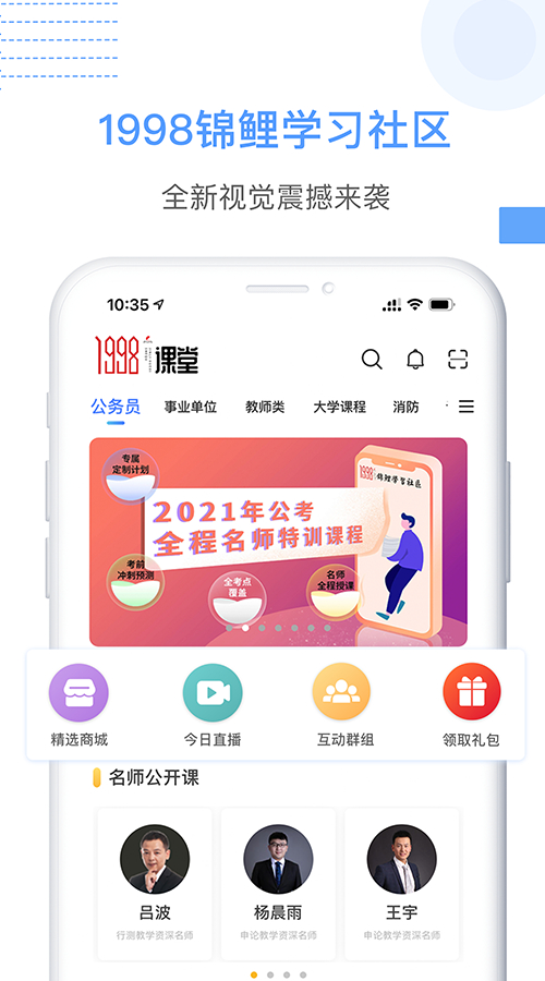 1998课堂是一款在线直播学习平台,平台涵盖了IT编程、软件开发职业培训、公考考级等上万门职业网课课程和在线直播课程,同时提供线下学习场所,完美实现线上线下融合,为你提供更专业的学习内容和学习环境。