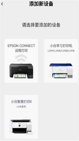 2、点击【暂无设备,前往绑定】,选择要添加的设备,目前仅支持EPSON、小白学习打印机、小白智慧打印II。