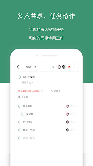 提供按天或按月查看任务的视图模式,便于直观掌握每日安排,任务可设置颜色标记与时间段,提升日程可视化效果。 2、番茄工作法集成 内置专注计时功能,帮助用户集中注意力完成任务,通过短时高效的工作节奏提升产出效率。 3、套娃式任务结构 支持主任务下创建多个子任务,适用于拆解复杂事项,使任务执行更具条理性与可操作性。 4、任务共享协作 允许将任务或清单分享给他人,通过链接邀请共同参与,便于多人协同处理家庭事务或团队项目。 5、循环任务设定 可为日常固定事项设置每日、每周或工作日重复提醒,并自动避开法定节假日,减少重复输入负担。怎么创建分组