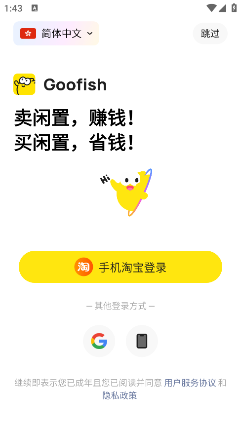 1、登录方式选择:支持支付宝、淘宝、闲鱼账号直接登录,新注册者按流程完成账号开通即可。