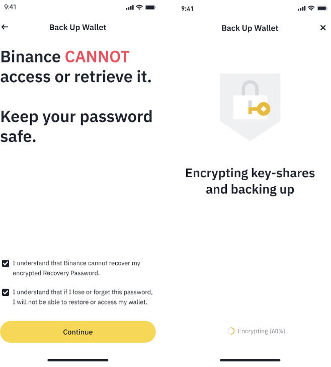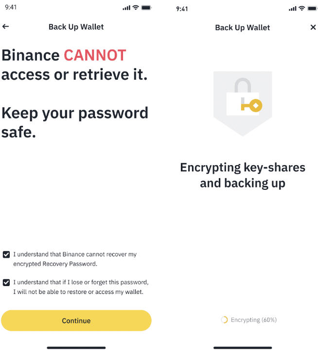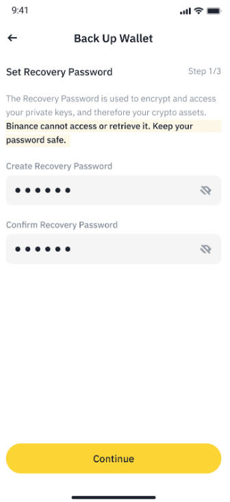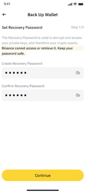 恢复密码用于对密钥分片进行加密。请将其妥善保管在安全位置,切勿向他人透露。如果不幸丢失或遗忘恢复密码,币安无法帮助您找回该密码,届时您将无法访问密钥分片备份和币安钱包。