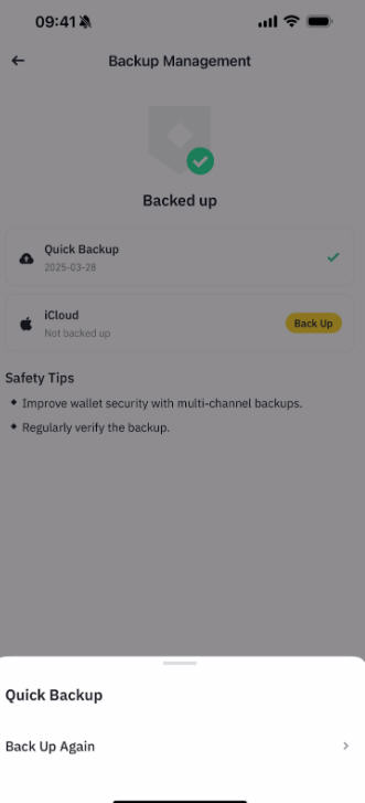 借助快捷备份,您可轻松备份钱包并使用币安安全验证随时恢复钱包,无需使用恢复密码。