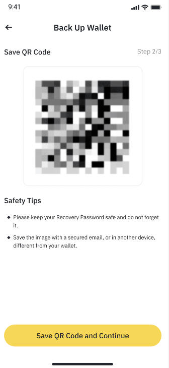 5. 保存二维码后,系统将提示您对备份进行验证。点击【继续】、扫描备份二维码并输入您的恢复密码。