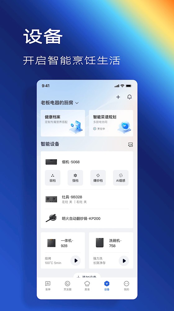 1、 智能设备联动:支持蓝牙连接老板智能厨电,选菜后自动同步参数至烟灶,实时调控火力与吸力,实现自动化烹饪。