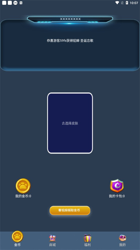 3、选定领取目标后,通过观看视频广告赚取金币,再用金币抽取皮肤卡碎片。