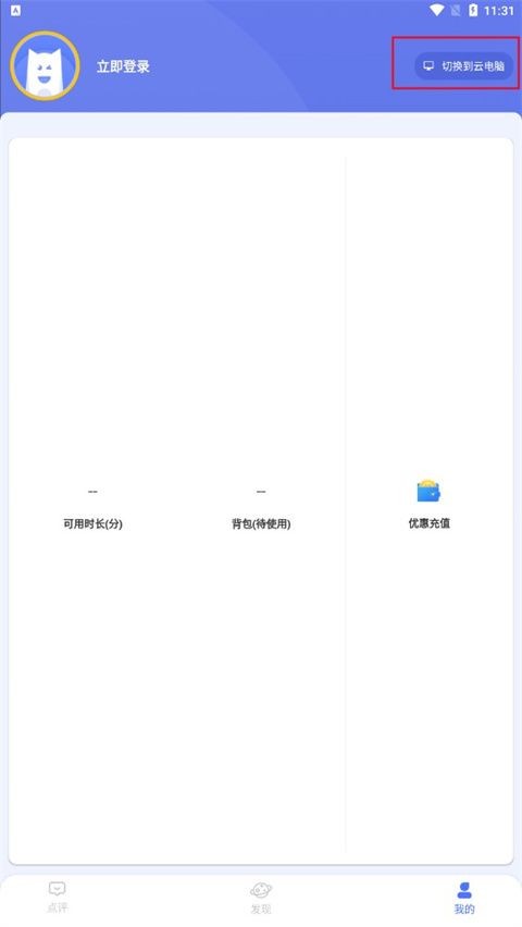 2、进入【我的】界面后,找到并点击右上方的【切换到云电脑】按钮,发起模式切换。