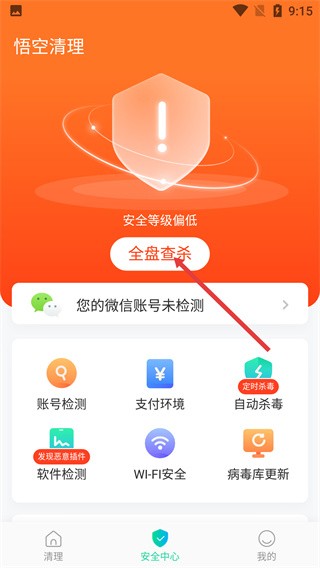 2、进入【安全中心】页面,若看到【安全等级偏低】提示,点击【全盘查杀】按钮,即可启动设备安全检测流程。