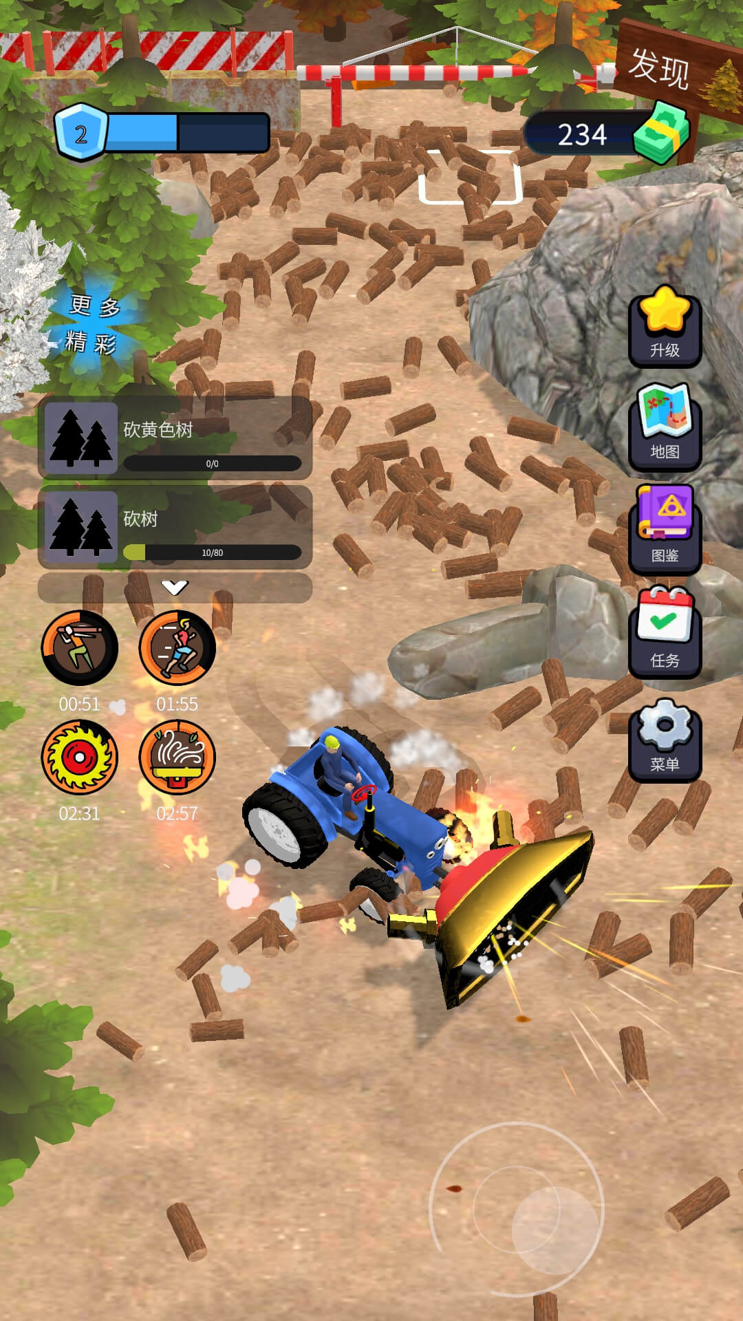 1、从原始斧头到电锯、激光切割器,升级工具可提升砍伐效率,甚至解锁“一键砍树”等便捷功能;