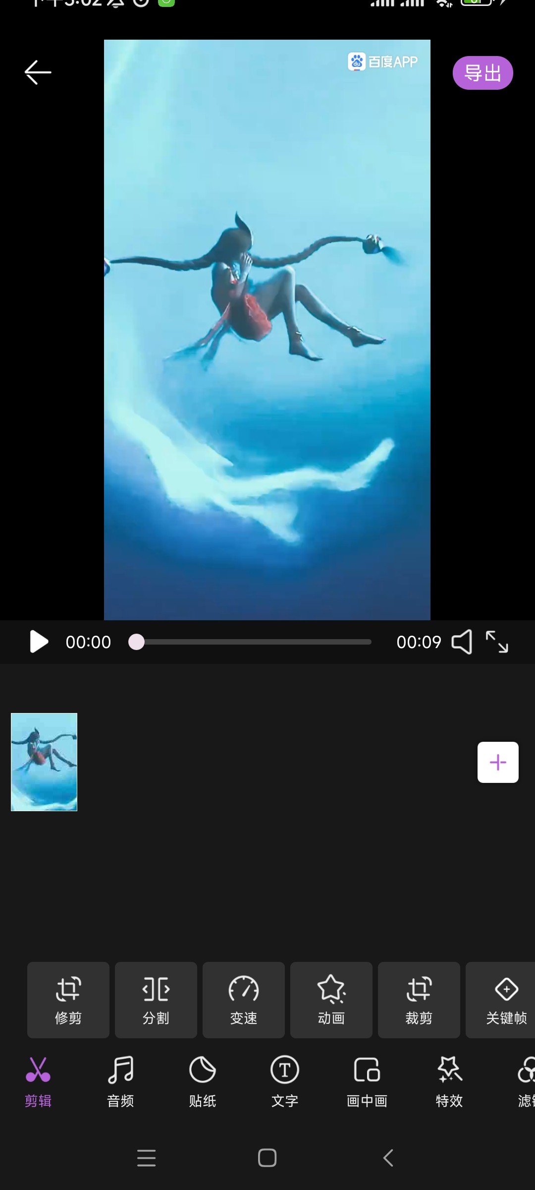5、视频剪辑:支持剪切、分割、快放、慢放等基础操作,还有特效、配乐、字幕、贴图、去水印功能。