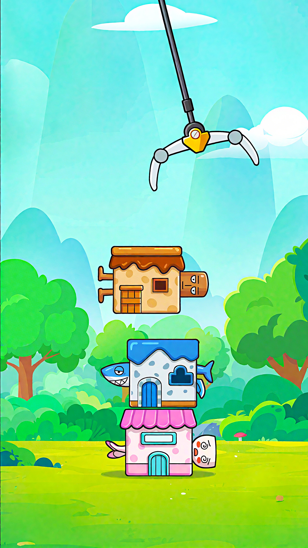 2、需要精准判断位置和时机,小心地把新房子平稳地放到已有的塔顶上,完成一次空中拼房。