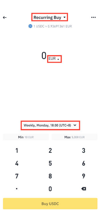 如要设置定投,只需从页面顶部选择【定投】即可。然后选择法币、加密货币币种以及购买频率。