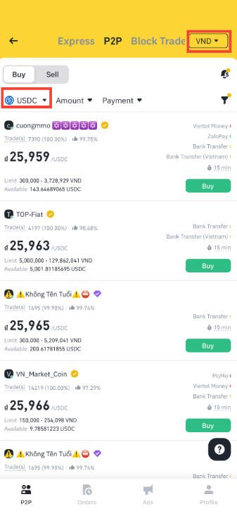 选好首选货币(本例为越南盾)和待买币种(本例为 USDC)后,即可浏览平台提供的各种报价。