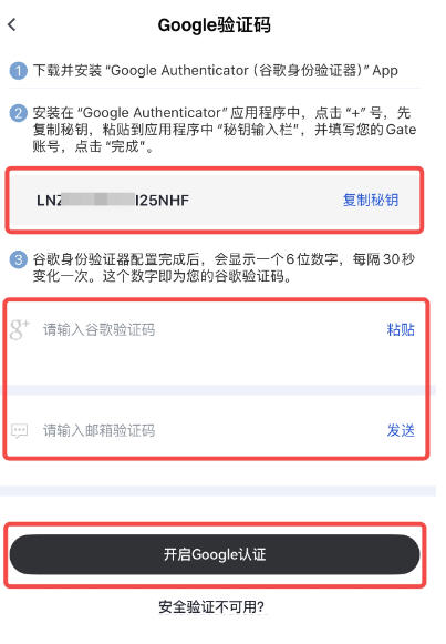 再次打开 Gate 手机 App,在【Google 绑定】页面,如下图所示,输入【谷歌/Gate 验证码】等验证信息后,点击【开启Google认证】即绑定成功。