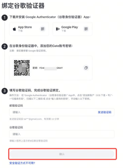 再次打开 Google 验证器绑定页面,如下图所示,输入【谷歌/Gate 验证码】等验证信息后,点击【确认】即绑定成功。