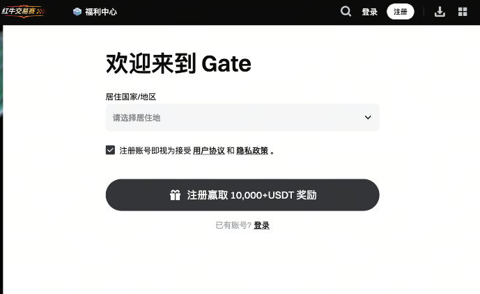 1.访问 Gate 官网,点击右上角的 “注册” 按钮,进入注册页面。在注册页面,根据提示填写“居住国家/地区”,勾选 “注册账号即视为接受 用户协议 和 隐私政策 ”,点击 “注册”。