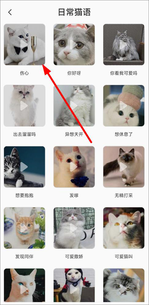 2、进入日常猫语页面,可看到伤心、你好、可爱撒娇等各类猫语,点击即可播放给猫咪聆听。
