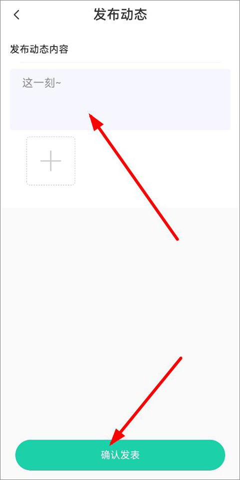 2、进入发布动态页面,输入动态内容并添加照片,点击确认发表,即可完成动态发布。