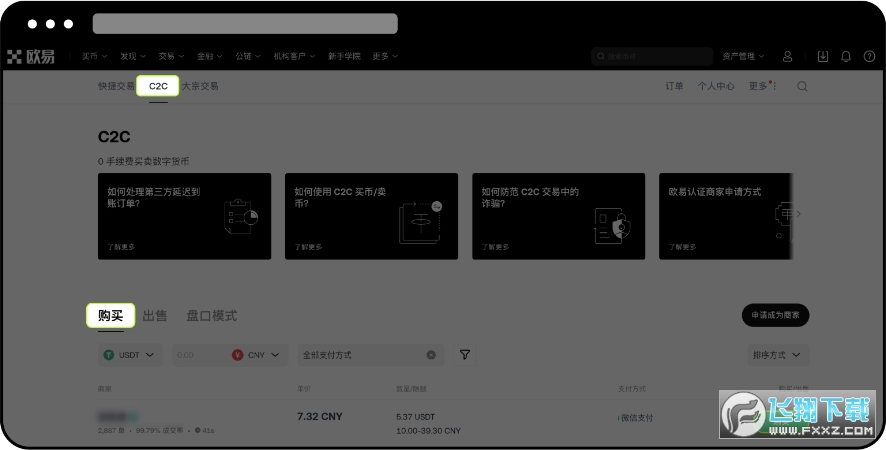 1. 打开官网,点击【买币】-【C2C 买币】-【C2C】-【购买】,选择可交易的商家进行购买
