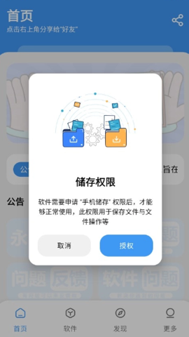 1、打开三岁软件库点击授权,授予软件存储权限
