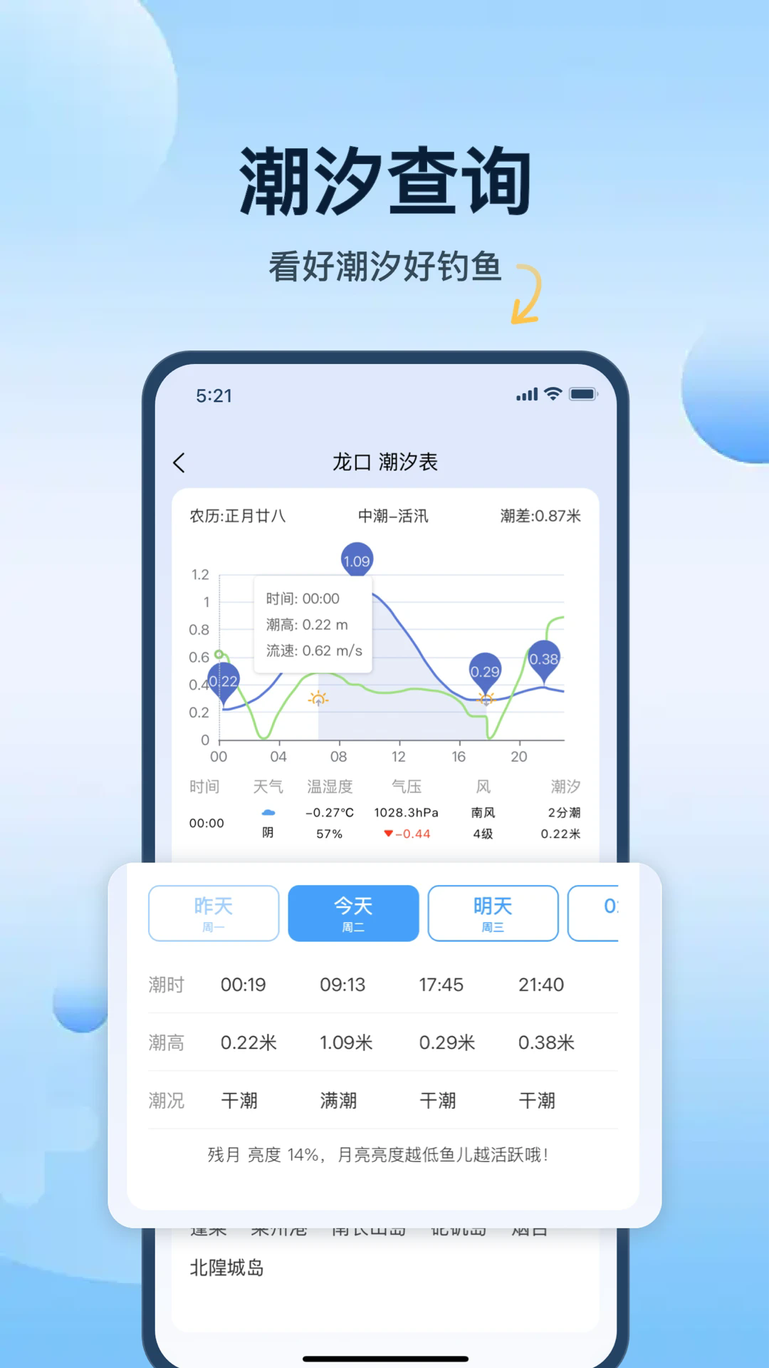 钓鱼天气预报软件提供全球潮汐预报和潮汐分析。