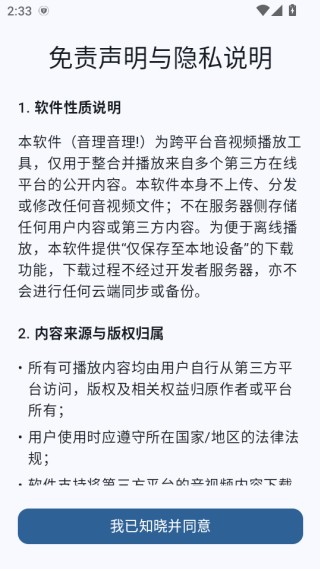 1、打开音理音理播放器,在免责声明页面等待几秒后,点击即可进入下一步操作。