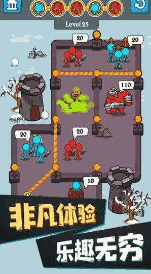 玩家需要合理调用自己的火柴人部下,以充分发挥他们的最大优势,杀死进攻的敌人,然后您还可以使用角色的组合技能来释放大招,适当的攻击策略,在这场疯狂的生存竞争中走得更远。你可以在这里随意挑战,做任何你想做的事,并使用道具。