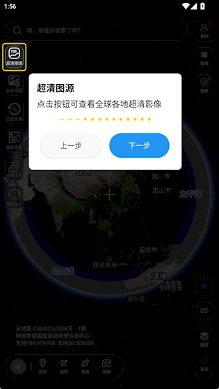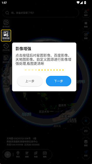 4、点击影像增强按钮后对星图影像、百度影像、天地图影像、自定义图源进行影像增强处理,看图更清晰