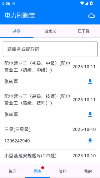 2、点击题库板块,包含共享、自定义、已下载三大模式题库,可根据学习需求灵活选择使用。