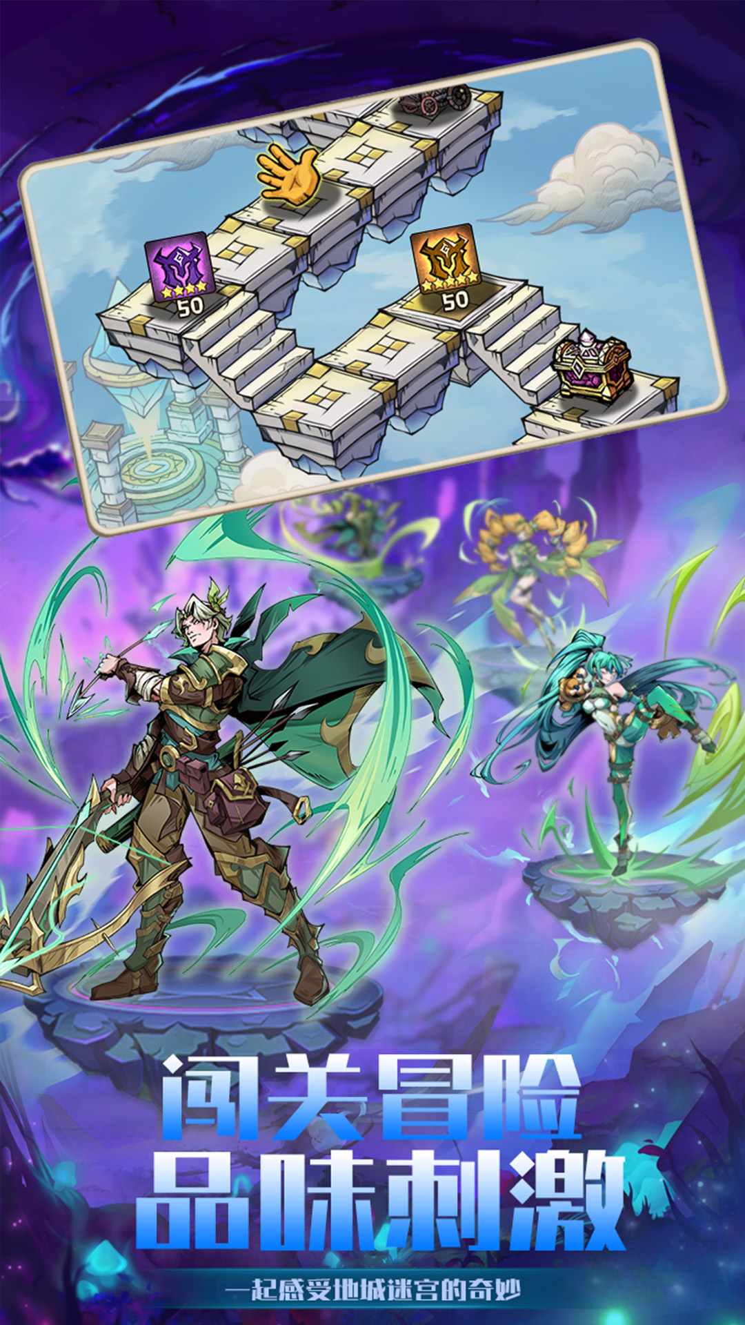 1、自由组合不同属性的英雄上阵,研究技能搭配,应对各种副本挑战。