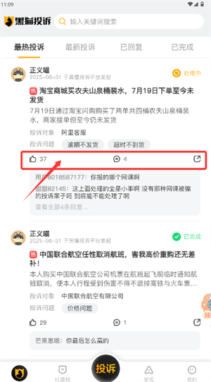 3.提交后返回首页可跟踪投诉进展,并对内容进行点赞与评论互动。
