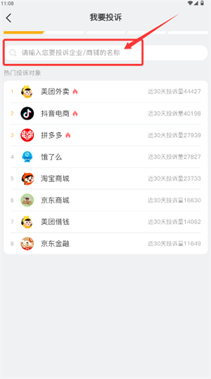 2.在投诉页面可通过搜索框输入商户名称,或选择热门被诉企业对象。