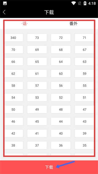 4、在章节选择页面,选定目标章节后,点击底部的下载按钮,即可完成对应漫画章节的操作。
