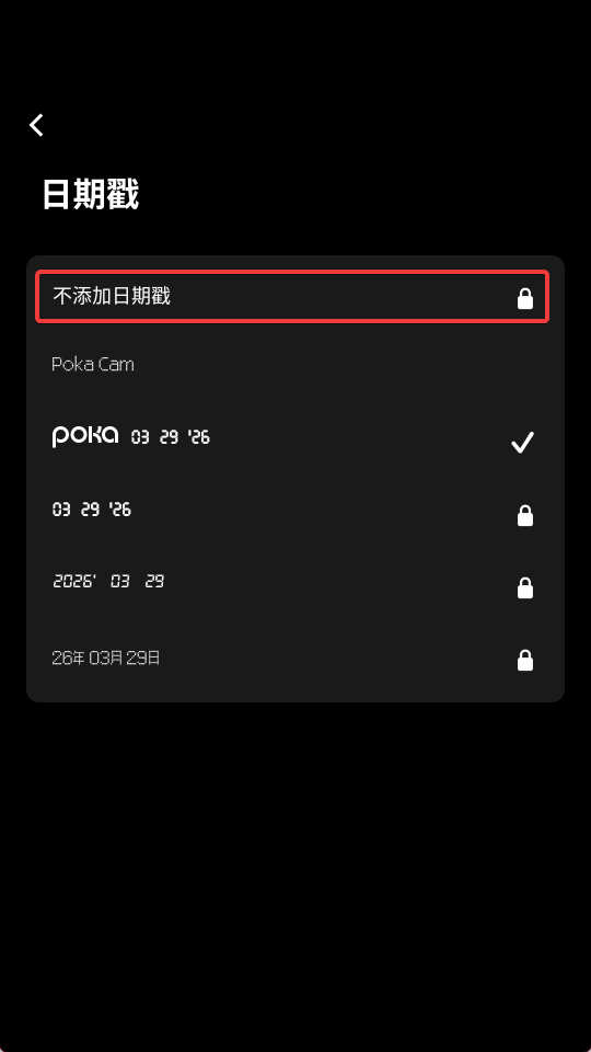 5、 照片后期处理:支持将已有照片导入应用,套用滤镜并添加如日期水印等元素。
