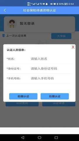 (3)输入姓名、身份证号和手机号码,选择使用前置摄像头或后置摄像头认证。(本人操作,可选择前置摄像头;他人操作帮助认证,可选择后置摄像头。