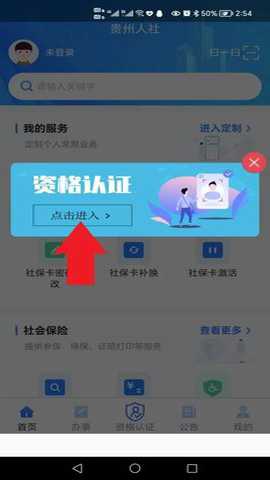 (1)安装后启动贵州人社APP,无需登录,点击“点击进入”(如图 1),进入资格认证功能(图 2)。