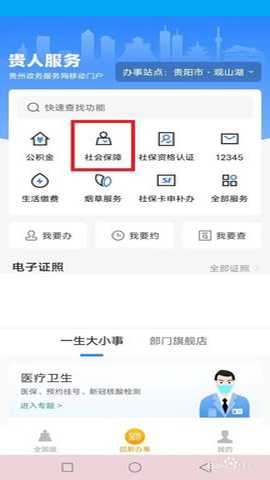 打开贵州人社软件,来黔办事页面点击选择社会保障项目。