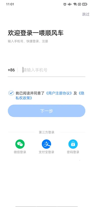 1、下载安装好一喂顺风车app,通过手机号或是微信、支付宝登入。