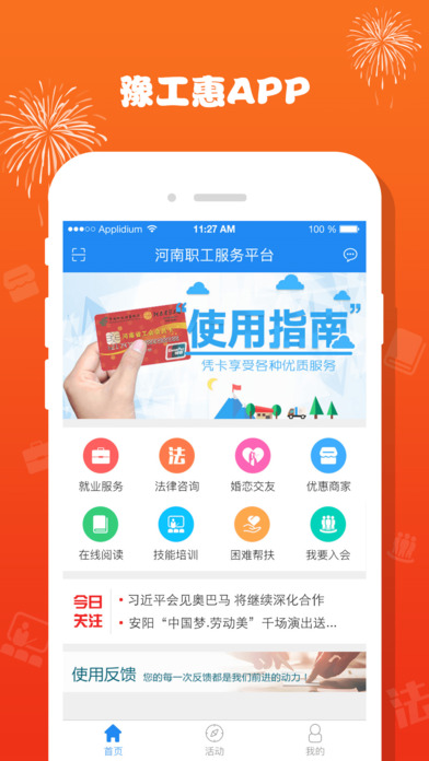 “豫工惠App”是河南省总工会推出的服务于广大职工的生活服务及帮扶平台,为河南省职工提供一体化、全方位的专属服务。目前包括了工会信息、就业服务、技能培训,法律咨询、困难帮扶、职工书屋等服务模块,意在让服务与被服务、关爱与被关爱在阳光下进行,帮助解决职工的真正所需,实现职工的心中所愿。工会后续还有更多的服务内容及普惠活动,敬请期待。